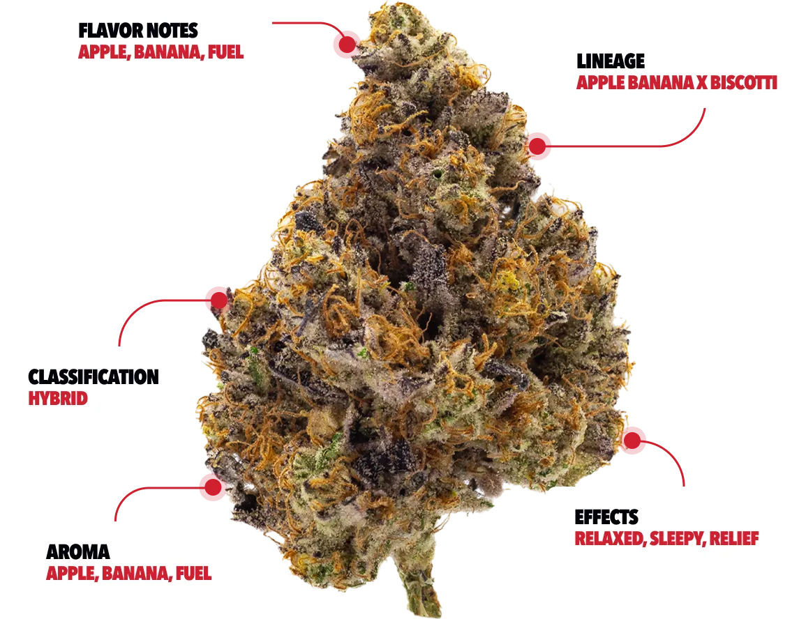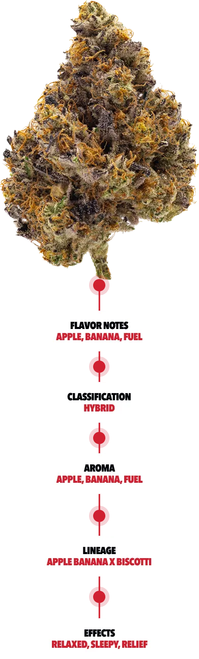 APPLE TING is a delicious hybrid that was created by crossing the Apples & Bananas strain with the Biscotti strain, rewarding the user with a mouthwatering taste of a sweet, fruity cookie. The overall effect of this potent strain is characterized as having an initial sharp blast of energy and creativity, then shifting to a giggly and euphoric high that will leave the user in a state of bliss. Both the Apples & Bananas and Biscotti strains are not only sought after due to the exquisite flavor profiles, but also the high levels of THC attributed to them.