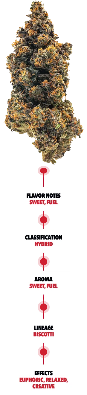 BREDDA is an indica-dominant hybrid version of the very popular Biscotti strain -- widely known and loved not only for it’s dense buds that are covered in trichomes that create a sparkling appearance, but also for it’s higher than average THC content and potent effects upon smoking. BREDDA is a cross between Gelato #25 and South Florida OG, coming together to create an undeniably sweet and gassy taste while also promoting strong feelings of euphoria and relaxation that you would expect from an OG. The aroma is a sweet mixture of earthy herbs with a fruity and cookie smell to it, making it equally pleasing to all of your senses. When you’re looking for a sweet, gassy and potent treat to wind down your day, please enjoy BREDDA!
