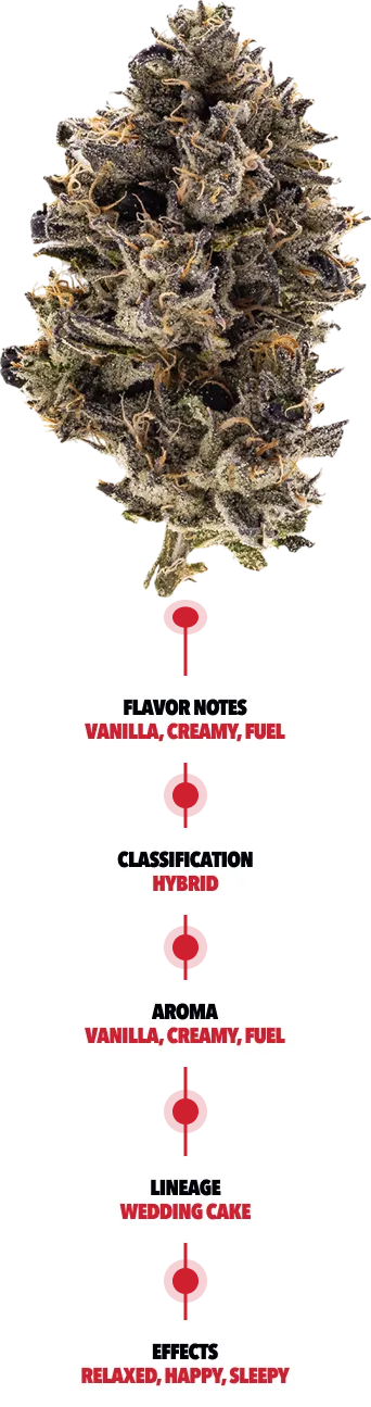 Its name says it all—it smells like vanilla frosting on the top of a birthday cake. The trichomes shine like a diamond even after the dry and cure. You'll smell and taste the OG behind the cake. Indica dominant hybrid with a high THC content, this sticky bud will cake up your grinder, pun intended.