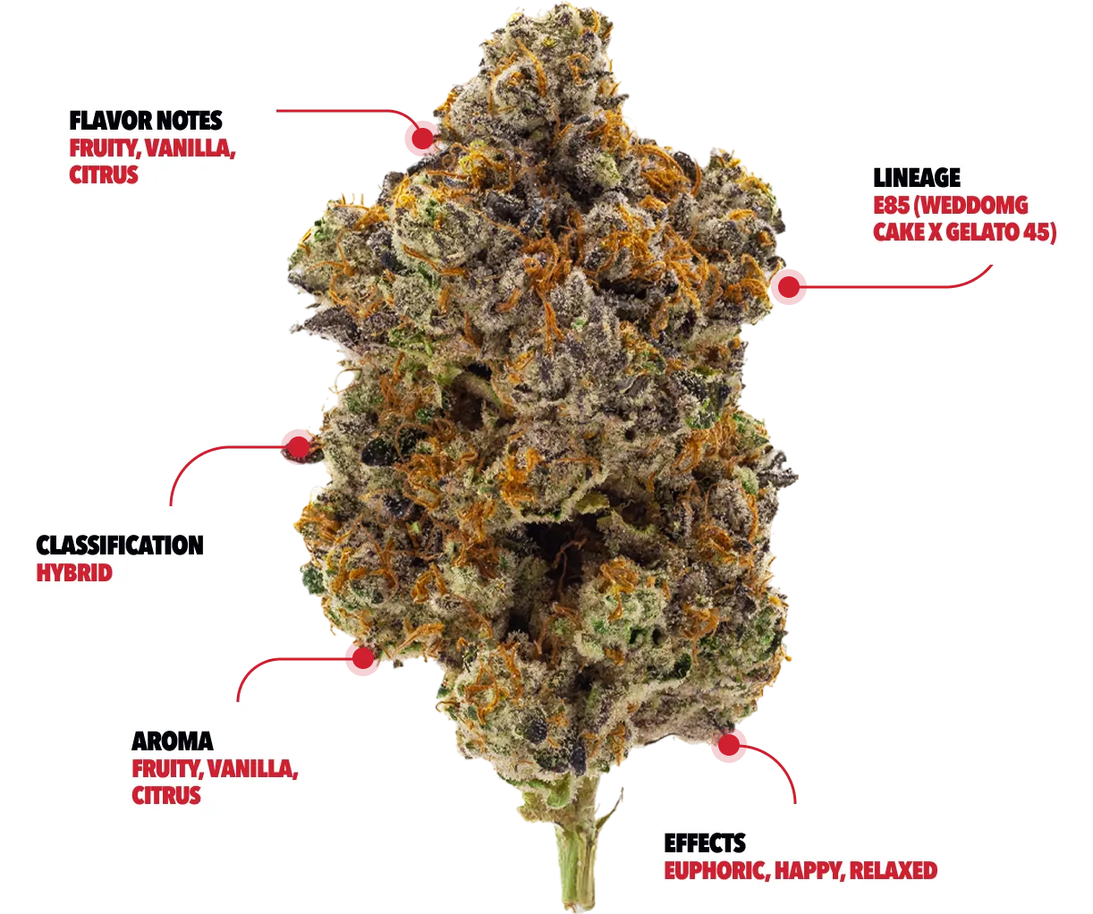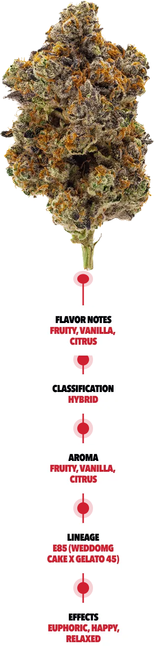 ICE KREAM is a smooth and balanced hybrid that is created through crossing the Wedding Cake and Gelato 45 strains, also known as E85. True to its name, the ICE KREAM is an extremely flavorful strain that blends together a medley of sweet fruit, vanilla crème, and sugary citrus that is also apparent through the aroma. Users often experience stimulating sensations in the head that then transport down to the rest of the body, eventually making its way back to the brain and locking the body down in a deep state of relaxation—like a brain freeze for your entire body, but in a good way.